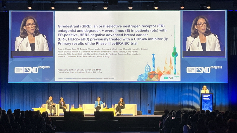 [ESMO 2025=독일 베를린]현재 유방암 치료의 핵심 전략 중 하나인 CDK4/6 억제제가 듣지 않는 환자를 위한 후속 전략 논의가 가속화되고 있다.또한 마찬가지 이유로 항체-약물 접합체(ADC) 신약과 병용요법에 대한 임상도 활발히 이뤄지고 있다는 점에서 과연 어느 약물이 차세대 표준으로 자리잡을지 관심이 모아지고 있다.CDK4/6 억제제 후속 전략 논의 활발…기레데스트란트 등 주목현지시각으로 18일 독일 베를린에서 진행중인 유럽종양학회 연례학술대회(ESMO)에서는 전이성 유방암에 대한 새로운 치료 전략을 논의하는 자리가 마련됐다.ESMO 2025에서 로슈의 SERD인 기레데스트란트의 3상 임상시험인 evERA BC이 공개됐다.일단 이 자리에서는 현재 HER2(사람 표피 성장인자 수용체 2) 음성 유방암의 핵심 약물인 CDK4/6 억제제에 반응하지 않는 환자를 위한 치료 전략이 논의됐다.로슈의 선택적 에스트로겐 수용체 분해제(SERD) 기레데스트란트(giredestrant)에 대한 3상 임상시험인 evERA BC와 셀큐리티의 게다톨로십(Gedatolisib)과 PI3K/AKT/mTOR(PAM) 억제제 병용 요법에 대한 1상 임상 VIKTORIA-1이 바로 그것이다.일단 evERA BC 임상은 CDK4/6 억제제와 내분비요법을 병용했으나 유방암이 계속해서 진행된 373명의 환자를 대상으로 기레데스트란트와 에베롤리무스 병용 요법을 평가했다.그 결과 ESR1 변이 환자 중 기레데스트란트와 에베롤리무스를 투약받은 환자의 무진행생존기간 평균은 9.99개월로 표준 내분비 요법과 에베롤리무스로 치료받은 환자 5.45개월에 비해 비약적으로 늘어났다.또한 12개월차 분석에서 기레데스트란트 병용군은 표준 내분비요법 병용군과 비교해 질병의 진행 또는 사망 위험이 무려 62%나 낮아지는 것을 확인했다(HR=0.38).전체 환자군(ITT)으로 넓혀도 이같은 경향은 유지됐다.기레데스트란트와 에베롤리무스를 먹은 환자는 무진행생존기간이 8.77개월로 표준 내분비요법군 5.49개월에 비해 좋은 성적을 거뒀다.객관적 반응률(ORR)을 봐도 ESR1 변이 환자 중 기레데스트란트를 투약한 환자는 26.6%, 대조군 13.8%를 상회했다.연구를 진행한 미국 보스톤의과대학 에리카 메이어(Erica Mayer) 교수는 "기레데스트란트와 에베롤리무스 병용군은 주요 하위군 전반에서 일관된 이점을 보여줬다"며 "특히 ESR1 변이 여부와 무관하게 이점이 나타난 것은 주목할만한 부분"이라고 설명했다.셀큐리티의 게다톨로십 3제 요법에 대한 임상인 VIKTORIA-1도 많은 관심을 받았다.또한 이번 ESMO에서는 CDK4/6 억제제가 듣지 않는 환자를 대상으로 셀큐리티의 게다톨로십 3제 요법의 임상적 효과를 확인하기 위한 VIKTORIA-1 임상도 함께 공개됐다.게다톨로십 3제 요법은 게다톨로십과 풀베스트란트(fulvestrant), 팔보시클립(palbociclib)에 대한 병용 요법.이번 연구는 이 3제 요법과 게다톨로십과 플베스트란트 2제 요법 및 풀베스트란트 단독 요법을 비교하는 방식으로 진행됐다.연구 결과 게다톨로십 3제 요법의 무진행생존기간은 9.3개월로 풀베스트란트 단독 요법의 2.0개월에 비해 월등하게 길었다.또한 게다톨로십 2제 요법 또한 무진행생존기간이 7.4개월로 마찬가지로 풀베스트란트 단독 요법 2.0개월에 비해 크게 높았다.전체 생존율을 봐도 게다톨로십 3제 병용은 불베스트란트 단독 요법에 비해 31%나 개선됐으며 2제 요법 또한 26%가 개선되는 효과를 발휘했다.객관적 반응율 또한 3제 요법은 32%, 2제 요법은 28.3%로 풀베스트란트 1%에 비해 압도적으로 좋았다.미국 시애틀 의과대학 사라 A. 허비츠(Sara A. Hurvitz) 교수는 "이번 연구는 게다톨로십 3제 요법이 CDK4/6 억제제가 듣지 않는 환자에게 매우 유망한 조합이라는 것을 보여준다"며 "새로운 표준 치료로 등극할 수 있을 것"이라고 전했다.ADC 신약 후보들 집중 조명…Sac-TMT 등 관심 집중이번 ESMO에서는 전이성 유방암에 대한 ADC 신약 후보에 대한 임상 결과도 함께 공개돼 이목을 끌었다.켈룬 바이오테크(Kelun-Biotech)가 머크(Merck)와 공동 개발한 ADC 사시투주맙 티루모테칸(Sacituzumab tirumotecan, Sac-TMT)에 대한 3상 임상이 대표적인 경우다.켈룬 바이오테크의 ADC 사시투주맙 티루모테칸에 대한 3상 임상도 공개됐다.OptiTROP-Breast02로 명명된 이 임상은 HR양성, HER2 음성 전이성 유방암(mBC) 환자 399명을 대상으로 진행한 3상 임상 시험이다.Sac-TMT를 투약한 환자와 선택적 화학 요법(ICC)를 받은 환자를 직접 비교하는 것이 임상의 개요.연구 결과 Sac-TMT를 투약한 환자의 무진행생존기간은 8.3개월로 ICC 환자군 4.1개월에 비해 좋은 성적을 보였다.6개월 무진행생존율을 비교해도 Sac-TMT 환자군은 61.4%에 달한데 반해 ICC 환자군은 25.7%로 큰 차이를 나타냈다.또한 객관적 반응률 또한 Sac-TMT군은 41.5%를 기록한 반면 ICC 환자군은 24.1%에 그쳤다.아직까지 전체생존율에 대한 분석은 끝나지 않았지만 현재까지 분석에 따르면 Sac-TMT 환자군이 ICC 환자군에 비해 67%나 우수한 성적을 보이고 있었다.연구를 진행한 중국 대련 의과대학 만리(Man Li) 교수는 "Sac-TMT는 ICC와 비교해 무진행 생존기간면에서 임상적으로 의미있는 개선을 보였다"며 "특히 설정한 모든 목표에서 일관되게 이점을 보인 것은 매우 중요한 의미를 갖는다"고 말했다.이와 함께 이번 ESMO에서