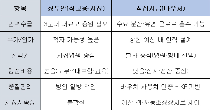 비대위는 대안으로 경기도형 '환자 직접지급(바우처)' 모델을 제안했다. 복잡한 공급자 직고용 구조 대신, 수요자인 환자에게 월 30만~50만원을 직접 지급하는 방식이다.