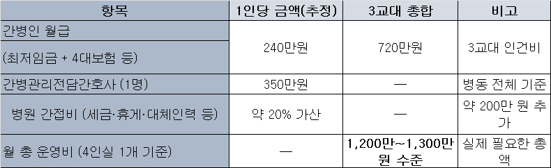 비대위는 "실제 원가를 계산하면 문제가 드러난다"고 지적했다. 간병인 3교대 인건비 720만원(1인당 240만원×3명), 간병관리 전담간호사 350만원, 4대보험·퇴직충당금 120만원, 대체·교육 인력비 200만원, 병원 간접비 100만원을 합하면 4인실 운영비는 월 1490만원에 달한다.