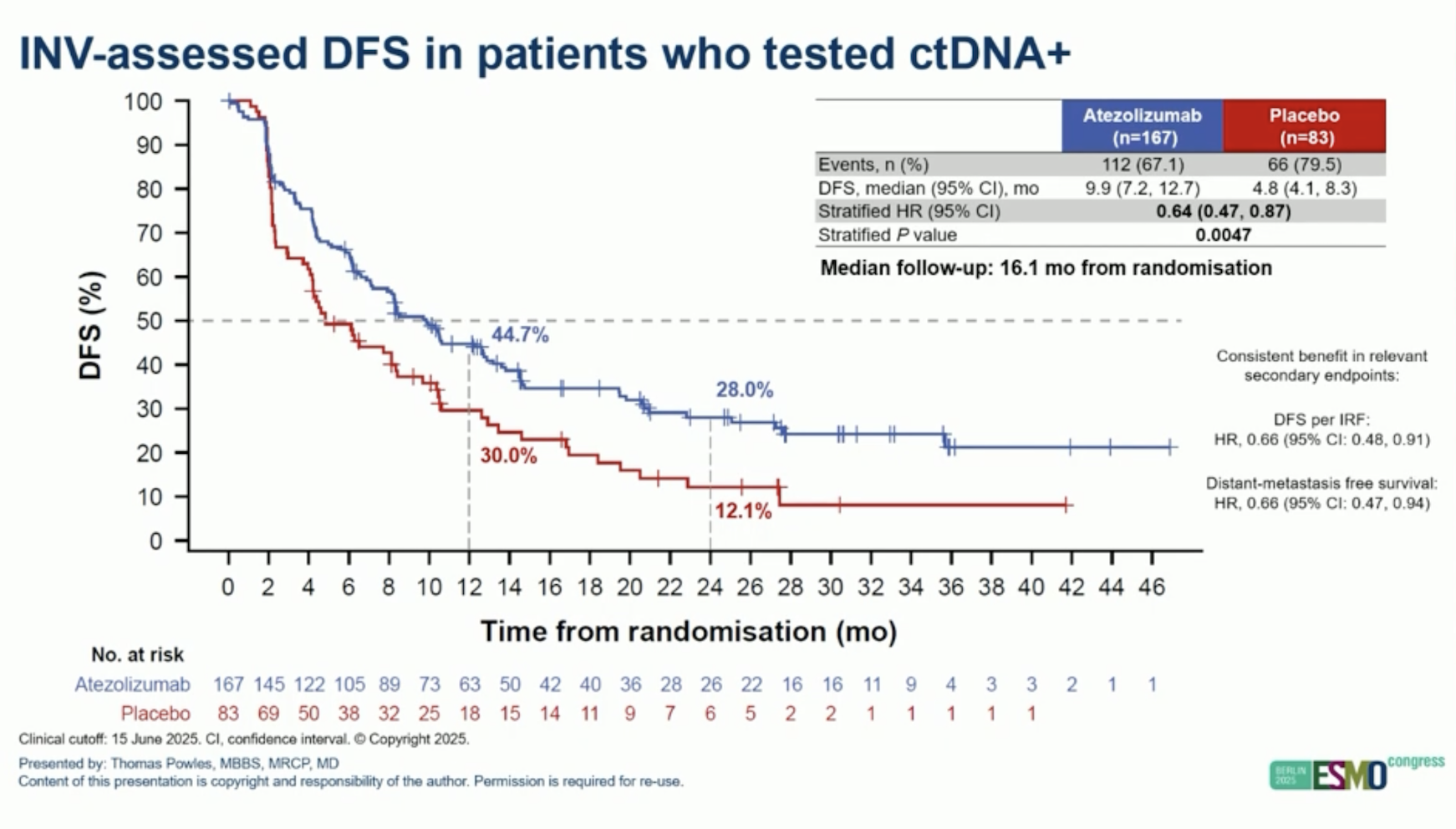 그결과 아테졸리주맙군의 DFS는 각각 9.9개월로 위약군(4.8개월)대비 통계적으로 의미있게 높았다(HR 0.64 (0.47–0.87); p=0.0047). 또한 OS 분석에서도 각각 32.8개월과 21.1개월(위약군)보다 통계적으로 의미있는 차이를 보였다(HR 0.59 (0.39–0.90); p=0.0131).