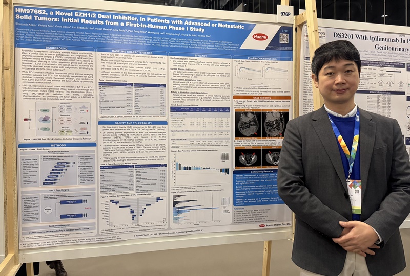 이날 발표된 임상 1상 결과 HM97662는 총 28명의 진행성 또는 전이성 고형암 환자를 대상으로 7개 용량군(50~350㎎)에서 관리 가능한 안전성 프로파일을 입증했다. 이 환자들은 대부분 4차 이상의 표준 치료 경험이 있어 대안 치료제가 제한된 고위험군이었다. 부분관해(PR) 및 장기간 안정성 병변(SD)도 관찰됐으며, 특히 기존 치료에 반응이 낮았던 종양 억제 유전자 SMARCA4 결손 환자에게서 유의미한 반응이 확인됐다.