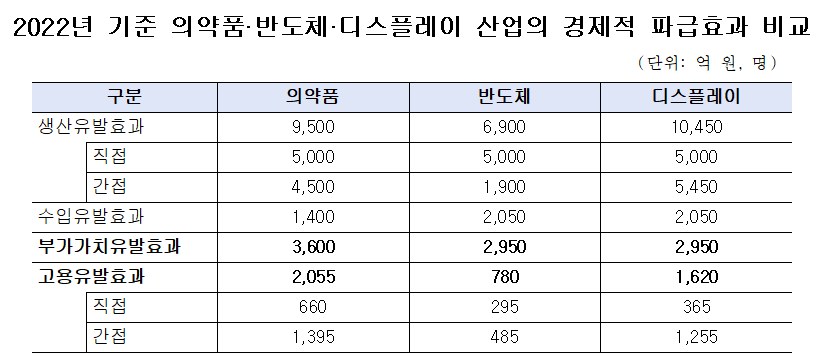 연구 보고서에 따르면 한국은행이 제시한 2020년과 2022년 산업연관표를 이용, 반도체·디스플레이·의약품 등 3개 국가첨단전략산업간의 연관관계를 수량적으로 분석한 결과 부가가치 및 고용유발효과에선 의약품산업이 가장 높은 것으로 분석됐다. 한국은행 산업연관표에서 계수 확인이 불가능한 이차전지산업을 제외하고 3개 국가첨단전략산업간 비교를 한 결과 생산유발효과는 디스플레이-의약품-반도체순으로 파악됐다.