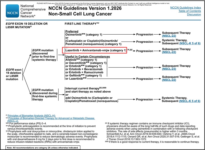 최근 NCCN은 비소세포폐암 분야 가이드라인을 개정, EGFR 변이 비소세포폐암 환자 1차 선옵션에 렉라자+리브리반트를 권고했다.