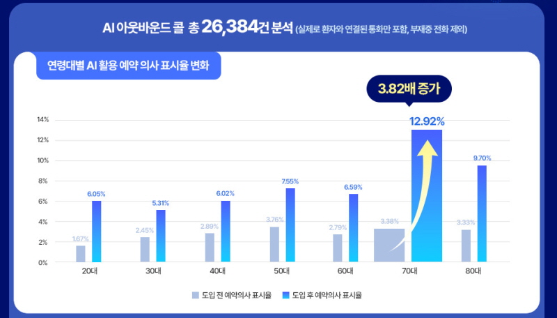 그 결과 실시간 AI 통화를 도입한 병원의 예약 전환율이 크게 상승했으며 특히 70대 환자층에서 가장 큰 예약 증가 효과가 나타난 것으로 확인됐다.