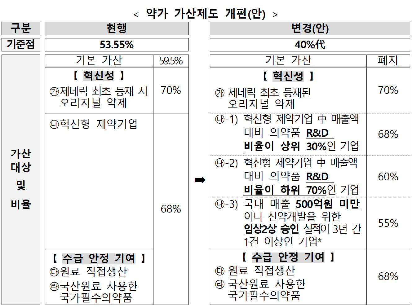 우선, 제네릭 및 특허만료 의약품의 약가 산정률은 우리의 약제비 구조와 주요국 사례들을 분석한 결과를 토대로 현행 53.55%에서 40%대로 조정한다. 2026년 하반기부터 시행한다.