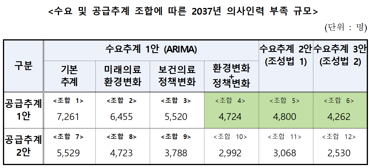 이에 따라 산출된 2037년 의사 부족 규모는 최소 4262명에서 최대 4800명이다. 정부는 이 추계 범위를 100% 반영하는 대신, 의학 교육의 질을 담보하기 위해 그중 75% 수준만을 증원분으로 결정했다.