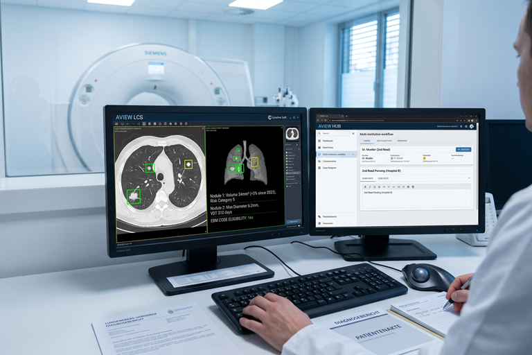 코어라인소프트의 폐암·심혈관질환(CAC)·만성폐쇄성폐질환(COPD) 동시 분석 솔루션 'AVIEW LCS Plus'와 중앙 관리 플랫폼 'AVIEW HUB'는 기존 병원 시스템(PACS/RIS)에 즉시 연결되는 플러그인 구조가 특징이다. 단일 CT로 폐암·심혈관·기종을 동시 분석할 수 있고, 복잡한 절차 없이 급여 청구가 가능하다는 의미다.