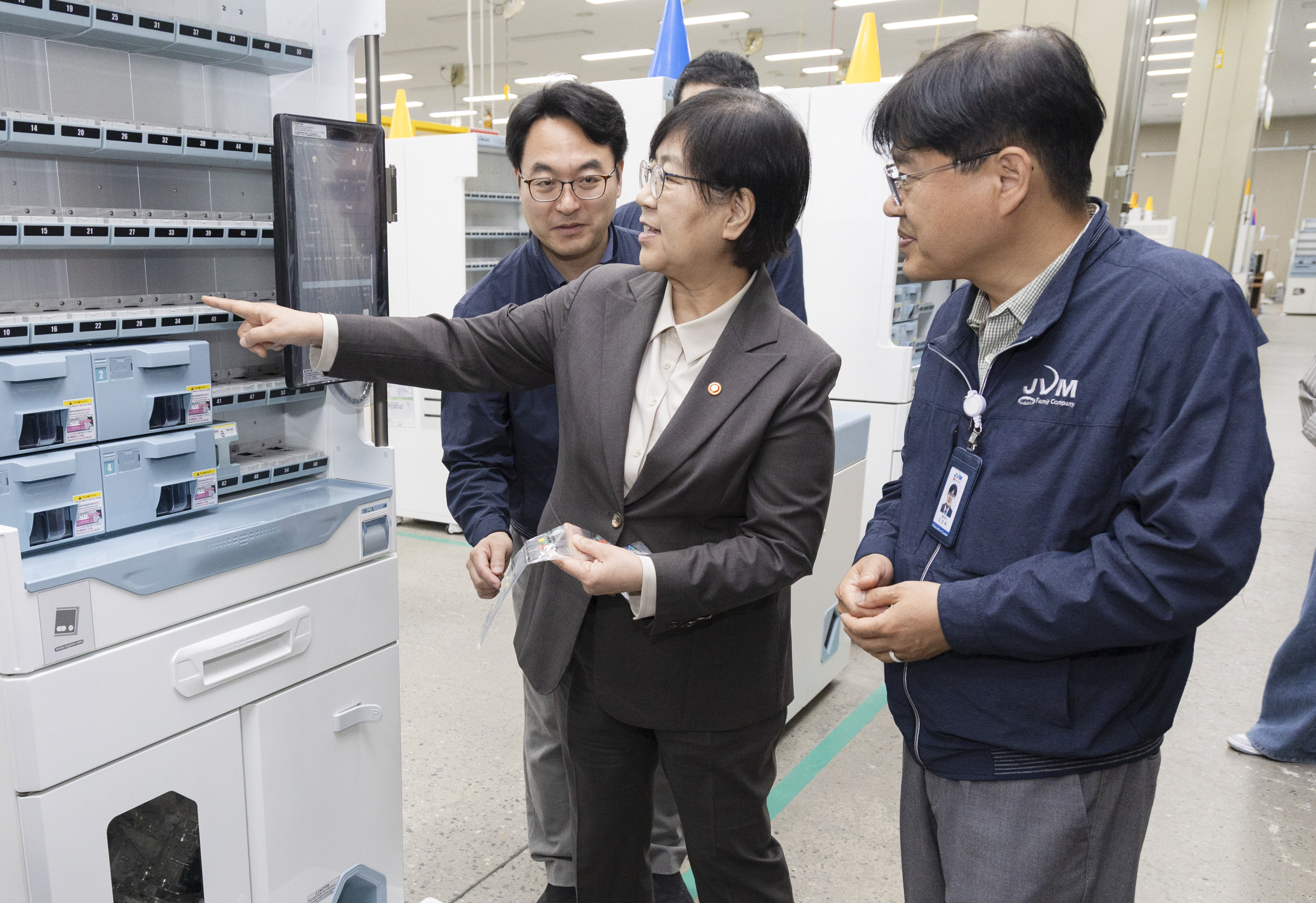 [메디칼타임즈=임수민 기자] 정은경 보건복지부 장관이 지난 20일 대구광역시 달서구에 위치한 약품 자동조제장비와 조제약 포장지 전문 생산기업인 제이브이엠(JVM)을 방문해 제조공정을 점검하고, 최근 중동사태 이후 원료 수급 상황과 현장의 애로사항을 청취했다.